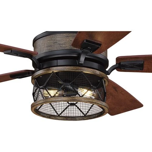 The Patriot Lighting® Elegant Home Bodhi 56-inch ceiling fan has five cherry and anigre plywood blades in black with a replica wood color. The unique cage feature surrounding the light will make this ceiling fan the interesting conversation piece you have been looking for in your living areas. A remote control is included to control fan speeds and fan light and this fan has a dual mount allowing it be installed for standard and sloped ceiling up to 23 degrees. The reversible, whisper-quiet three-speed motor provides upward and downward airflow for desired air circulation and year-round comfort.