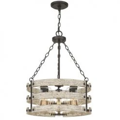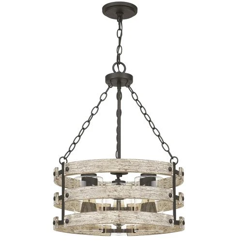 - Matte black and wood finish pendant offers an industrial-style casual elegance