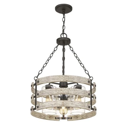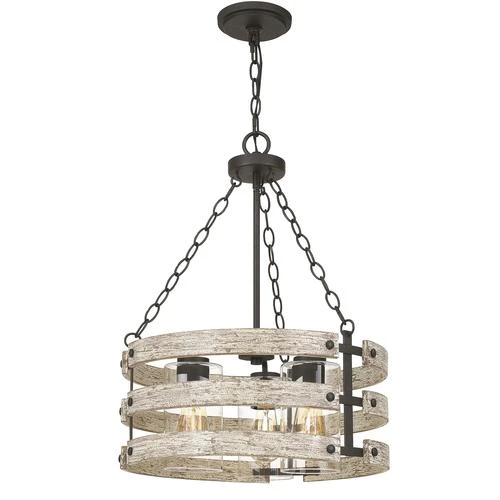 The Patriot Lighting® Elegant Home Darring three-light pendant in a matte black and wood finish offers an industrial-style casual elegance in any decor. The clear glass is designed to cast a soft ambient light over a wide area, illuminating any living space decor.
