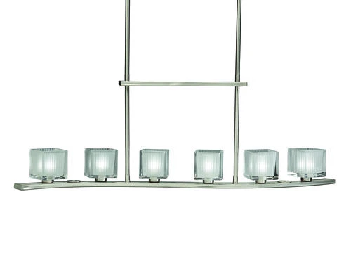 This Glacial 36″ Brushed Nickel 6-Light Island Light is beautifully crafted from durable metal and appointed with clear with inside etched glass. This island light includes the mounting hardware and installation instructions. This light fixture requires (6) 40 watt G9 halogen bulbs (included).