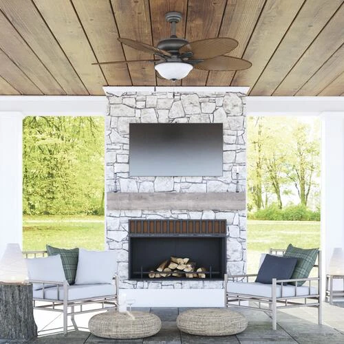The Patriot Lighting Florida Breeze ceiling fan offers you a palm blade for your nautically-inspired space. The damp rated Florida Breeze ceiling fan comes with two 8-1/2-Watt LED bulbs for additional savings.