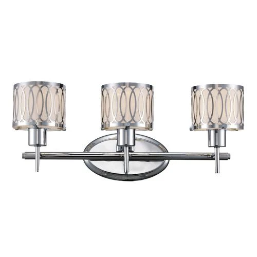 This three-light vanity light features a smooth and sophisticated chrome finish. The acrylic shades have an impeccable white finish and ringlet accent design that completes the glistening look. This modern accent piece will complement nearly any décor.