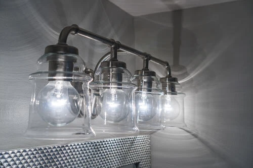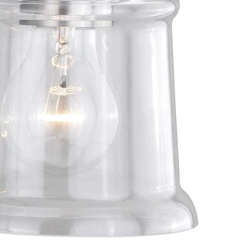 Clean retro lines define this beautiful collection called Toledo. Notes of industrial and farmhouse tradition are defined by the sheen of satin nickel and elegance of clear blown glass. Combine that with a vintage Edison style filament bulb to complete the look. Versatile reversible mounting option lets you install this fixture up or down. This bathroom light is perfect over medium vanities or as a pair over double sinks.