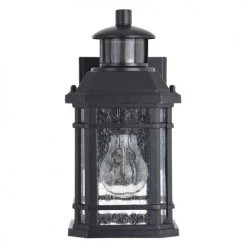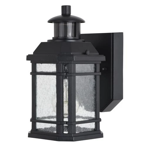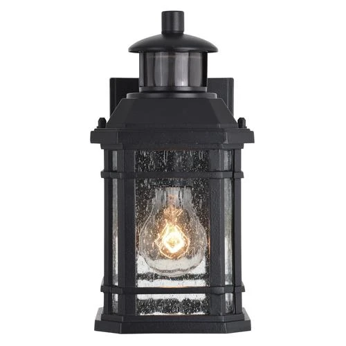 This Patriot Lighting® Elizabeth II light with Dualux technology makes this piece not only stylish but practical. The textured black finish and clear seeded glass adds a modern touch. The motion-activated security feature allows you to feel at ease when someone approaches your home. This light includes adjustable sensitivity ranges between 5 and 40 feet to fit your needs. Additionally, the energy-saving adjustable shutoff delay can be set between 5 seconds and 3 minutes. Dualux technology features two-level lighting; at dusk the light automatically turns on to an ambient light, then brightens to 100 percent when motion is detected. Moreover, the Elizabeth II outdoor motion-sensing wall light has an advanced feature allowing the low-level light to be adjustable from 0 to 50 percent of full brightness to customize your needs.