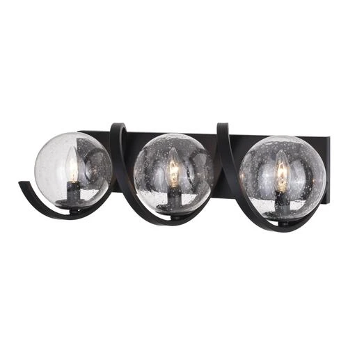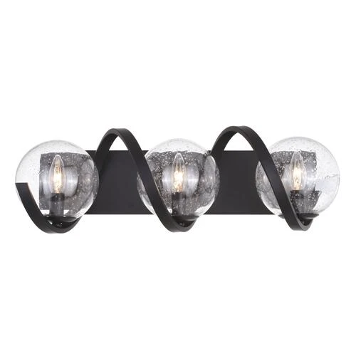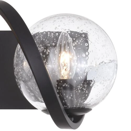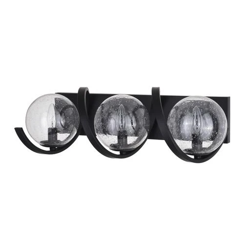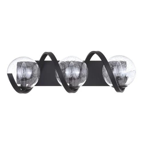 Fun and interesting are the best words to describe the Patriot Lighting® Twyla collection. The matte black finish and clear seeded glass shades exude a modern appeal. A wavy band surrounds each light source encased by a globe. This three-light wall fixture is ideal for any bath, bedroom, or living space. Wait no longer, add this light to your space and don’t forget to wave.