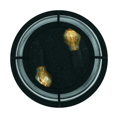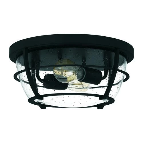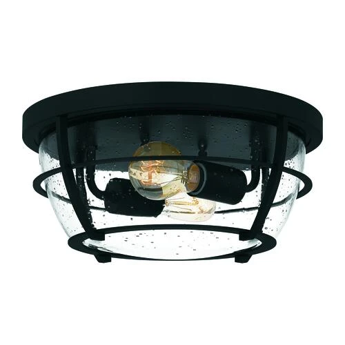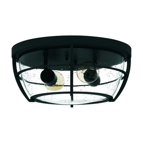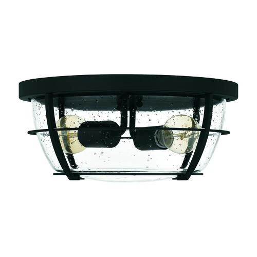With nautical-inspired elements, this fixture is an ideal style for any home. The matte black metal finish and clear seeded glass complement the overall design. This two-light flush mount will light up any room with its caged glass design.