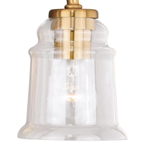 Clean retro lines define this beautiful collection called Toledo. Notes of industrial and farmhouse tradition are defined by the sheen of natural brass and elegance of clear blown glass. Combine that with a vintage Edison style filament bulb to complete the look. Versatile reversible mounting option lets you install this fixture up or down. This bathroom light is perfect over small vanities or as a pair over double sinks.