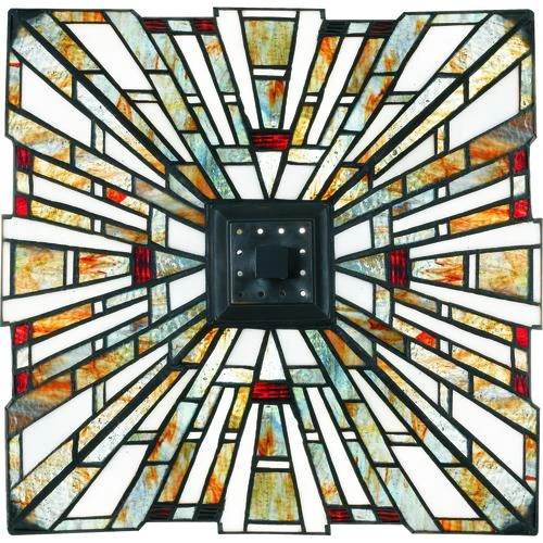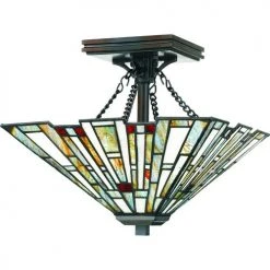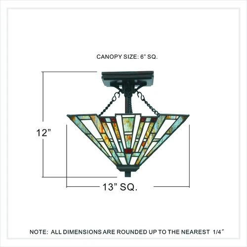 The warm shades of amber, bisque, and mossy green of this handcrafted Tiffany-style semi-flush mount will illuminate your home beautifully. The clean geometric pattern is complemented by a rich bronze base and is in keeping with the Arts & Crafts style.